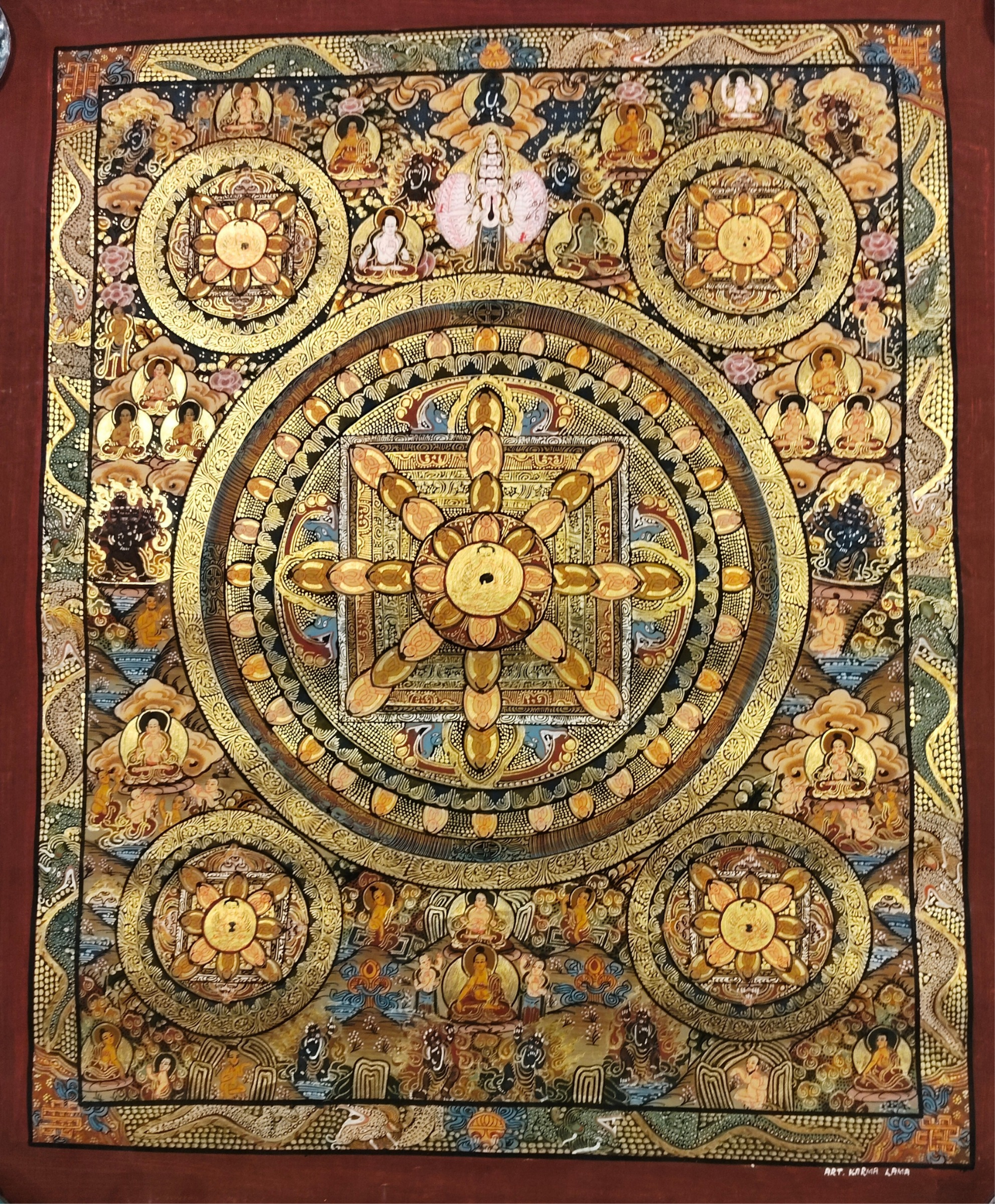 Experience the powerful energy of this 135 Buddha Mandala, hand-painted with traditional techniques and adorned with shimmering gold details in Gold Cave style.