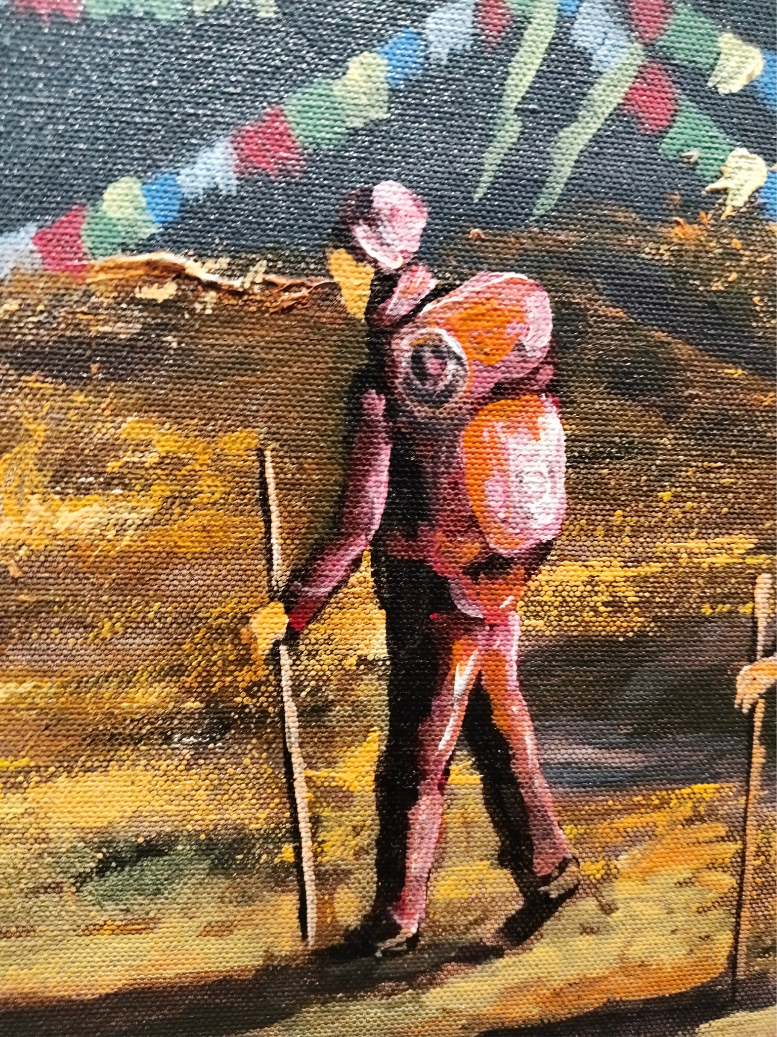 Painted by Surya Lama, a skilled Nepali artist known for bringing Himalayan landscapes to life with vivid colour and deep emotion, this masterpiece radiates peace, strength, and inspiration.